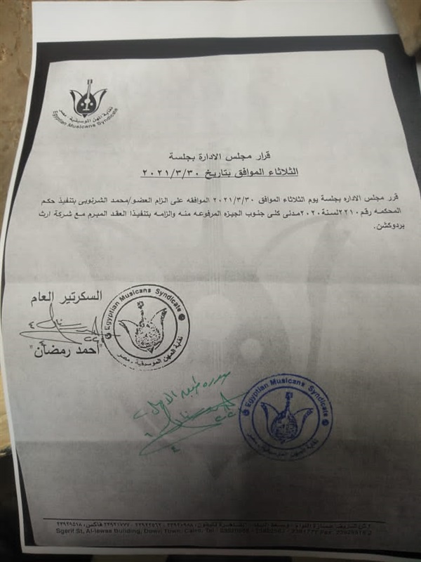 قرر مجلس نقابة المهن الموسيقية في اجتماعه الأخير الموافقة علي إلزام العضو محمد الشرنوبي بتنفيذ حكم المحكمة رقم ٢٢١٠ لسنة ٢٠٢٠ مدني كلي جنوب الجيزة المرفوعة منه وإلزامه بتنفيذ العقد المبرم بينه وبين شركة إيرث برودكشن.