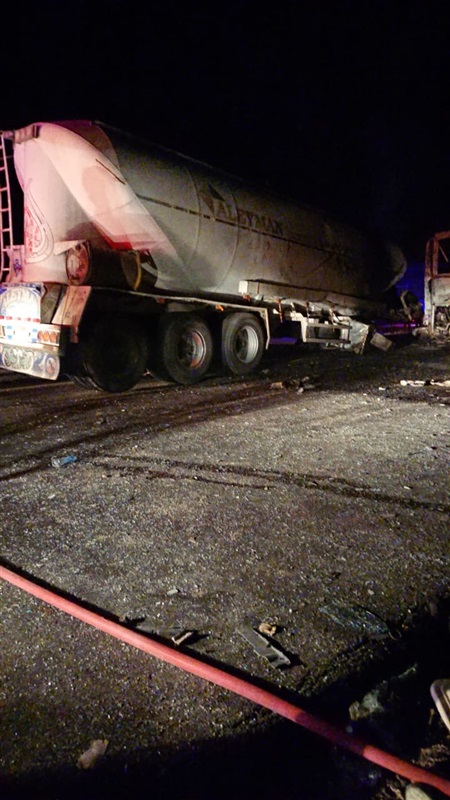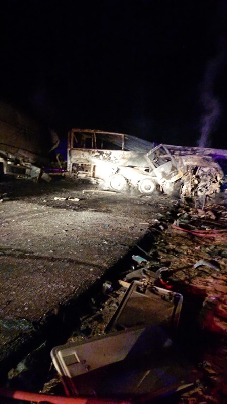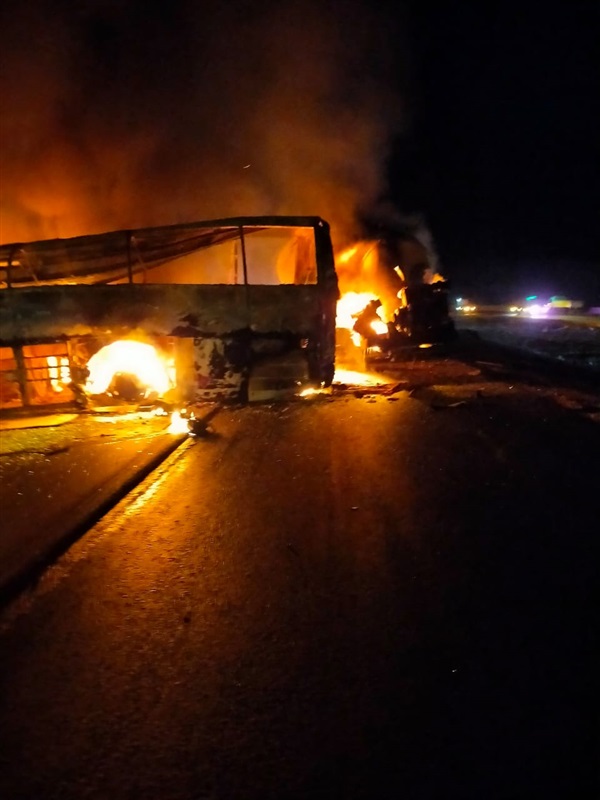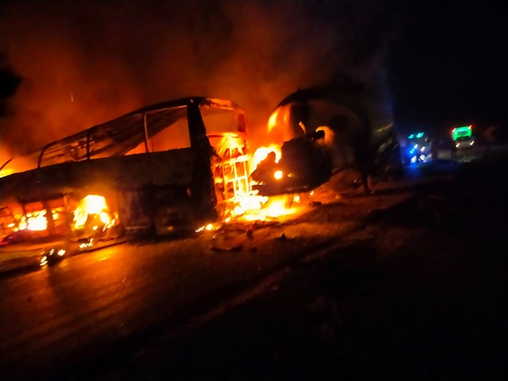 وقوع حادث تصادم بين أتوبيس نقل الركاب وسيارة نقل "خلاطة أسمنتية" على الطريق مما نتج عنه اشتعال النيران فى الأتوبيس وتفحمه بالكامل.