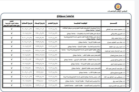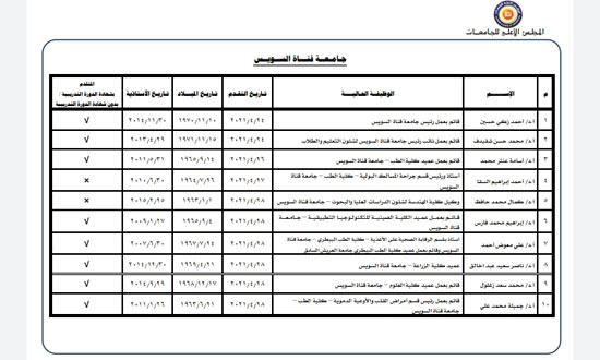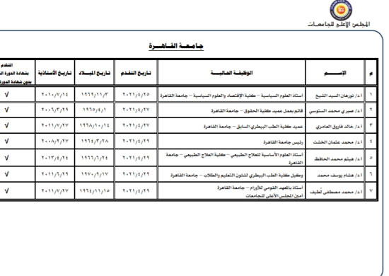 أعلن المجلس الأعلى للجامعات القائمة المبدئية بأسماء المرشحين لرئاسة 8 جامعات حكومية وهى جامعات "بنها – قناة السويس – حلوان – السويس – القاهرة – دمياط – سوهاج – بني سويف"، وذلك بعد غلق باب التقدم فى تمام الساعة الخامسة مساءً بمقر أمانة المجلس الأعلى للجامعات.