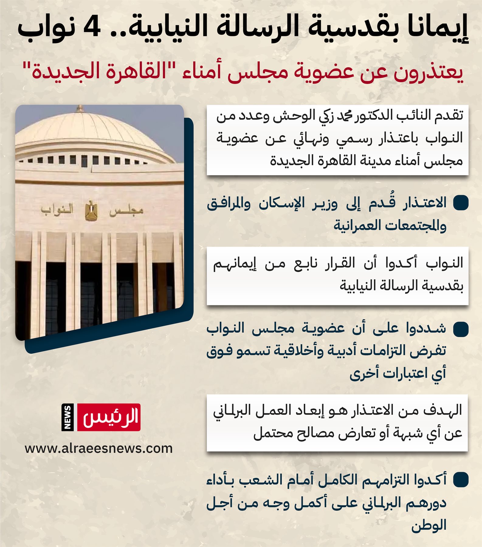 عاجل| استقالة جماعية لوكيل مجلس النواب و3 نواب من مجلس أمناء القاهرة الجديدة (إنفوجراف)